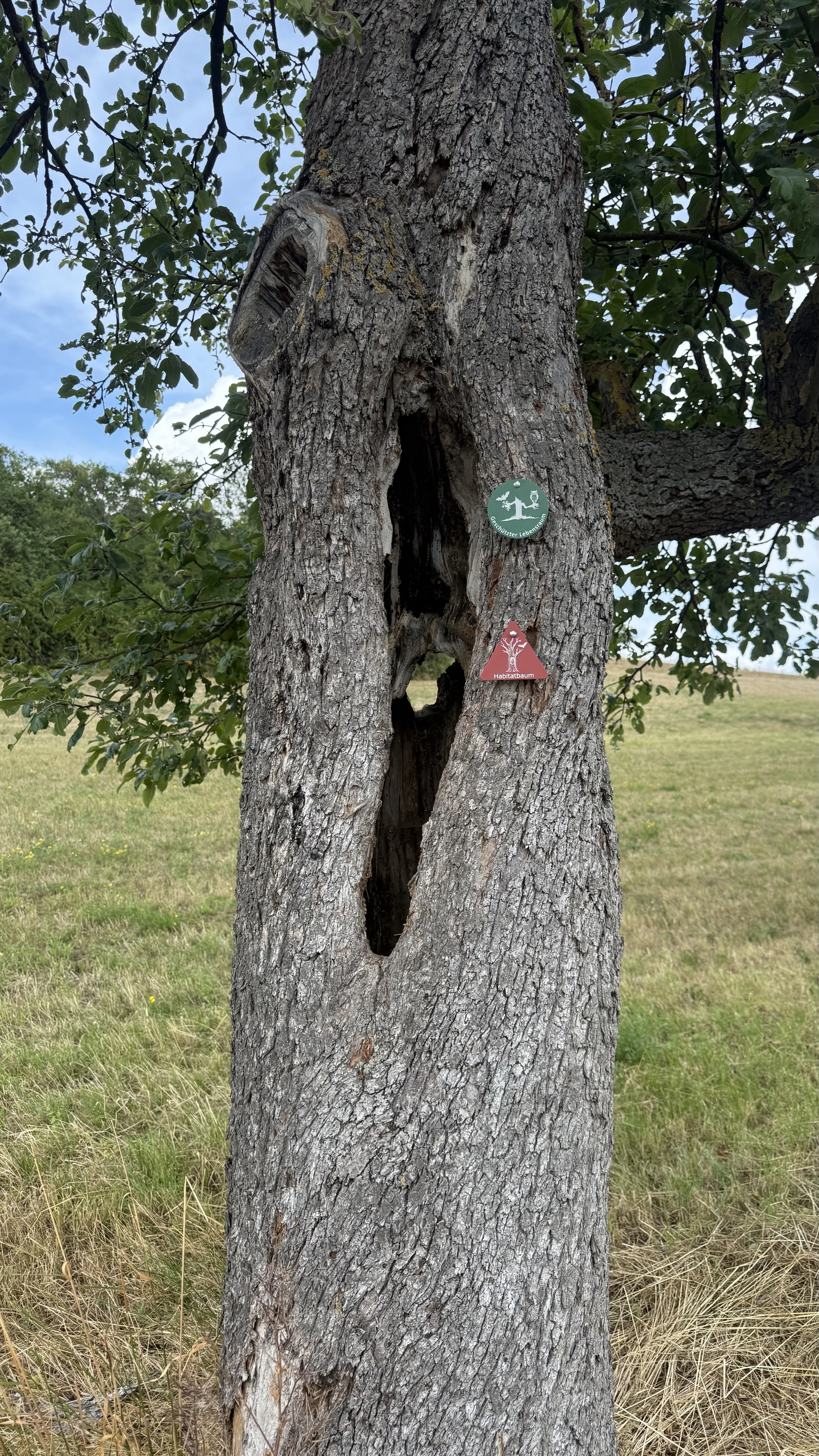 Ein Habitatbaum mit einer gut sichtbaren Baummarke oder Baumplakette trägt maßgeblich zum Artenschutz bei.